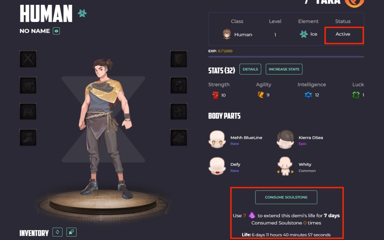 Once the Demi Heroes is activated, their 7 days lifespan clock will start counting. After the first 7 days, Demi Heroes must consume Soul Stones to remain alive. The amount of required Soul Stone will start at 7 and increase by 7 units after each use. Demi Heroes will have 7 more days to live after each use of Soul Stones.